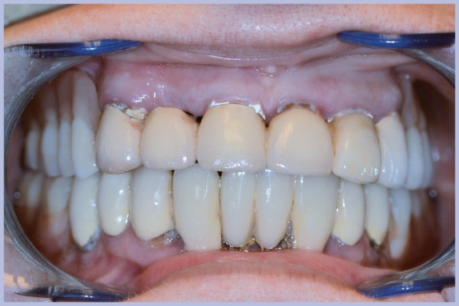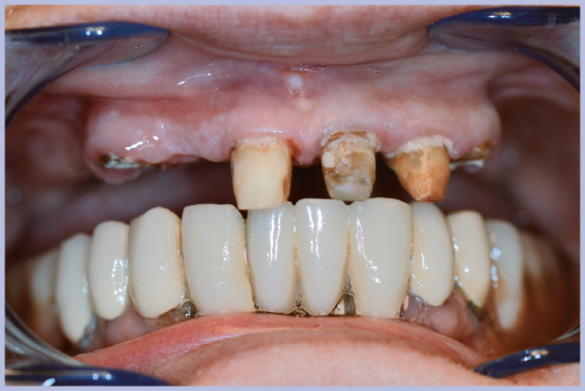 Si è presentata presso il nostro studio una paziente di 73 anni portatrice di una protesi mista (fissa e mobile) nel mascellare superiore (Fig. 1). Si è pianificata una riabilitazione immediata dell’intera arcata mediante tecnica tipo All-on-Four.