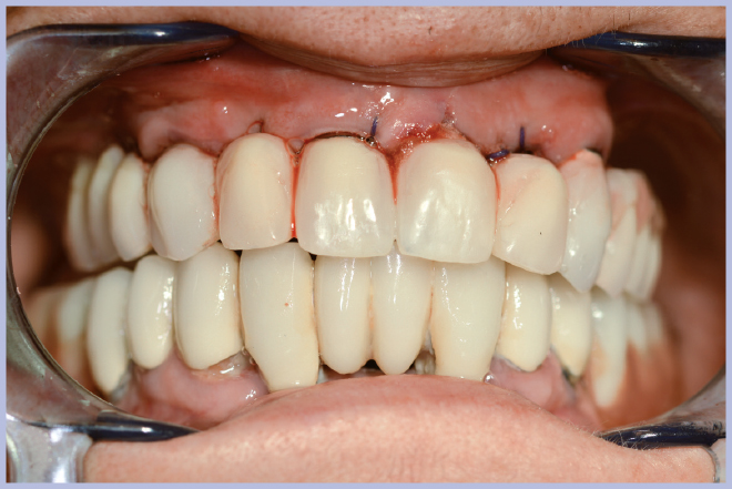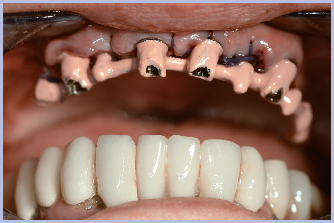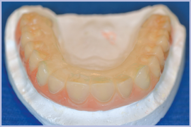 La nuova protesi, realizzata in materiale composito sul modello di quella pre-esistente (Fig. 9), è stata poi ribasata in bocca sull’armatura di rinforzo fissata ai monconi (Fig. 10). Ad indurimento avvenuto della resina per ribasature, si sono rimosse le viti e si è rifinita la protesi. L’operazione di rifinitura da parte del tecnico è di grande importanza, perché si deve il più possibile ridurre l’estensione della flangia vestibolare al fine di favorire una buona detersione da parte del paziente.