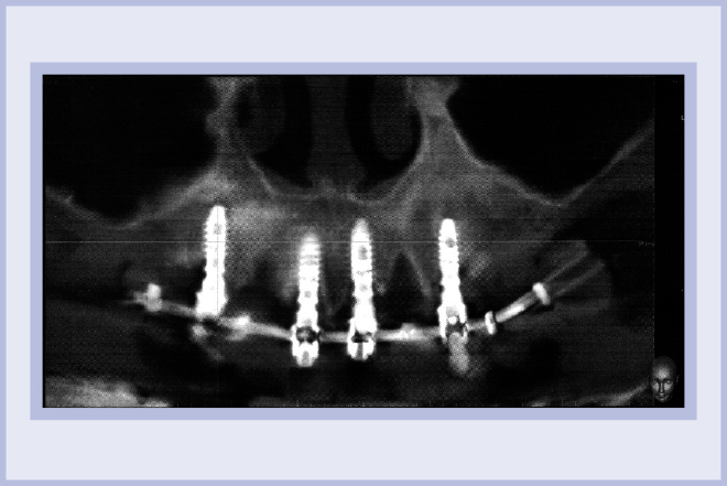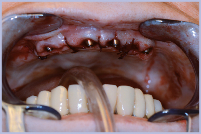 Dopo l’estrazione dei 3 elementi residui (Fig. 2), sono stati posizionati 4 impianti Max Stability Ø3,75 mm (2 di lunghezza 10 mm e 2 di lunghezza 12 mm).