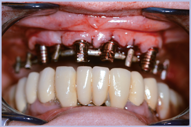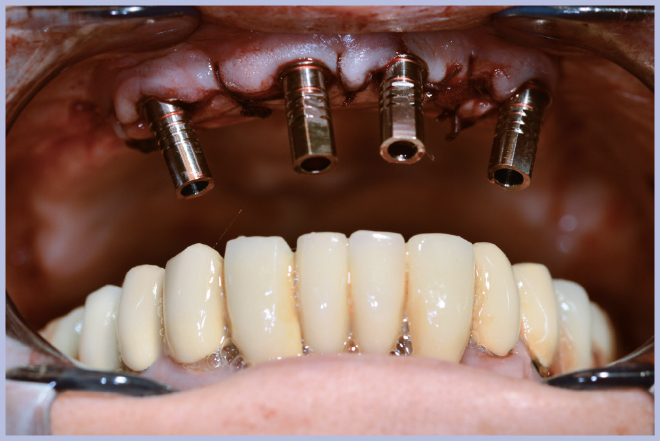 Dopo il posizionamento implantare si sono utilizzati 4 monconi per protesi avvitata angolati a 25°. Dato che non si è utilizzato alcun modello in gesso ma si è lavorato direttamente in bocca, la procedura ottimale in questi casi è quella di rimuovere dai monconi gli esagoni Exacone® 360°.