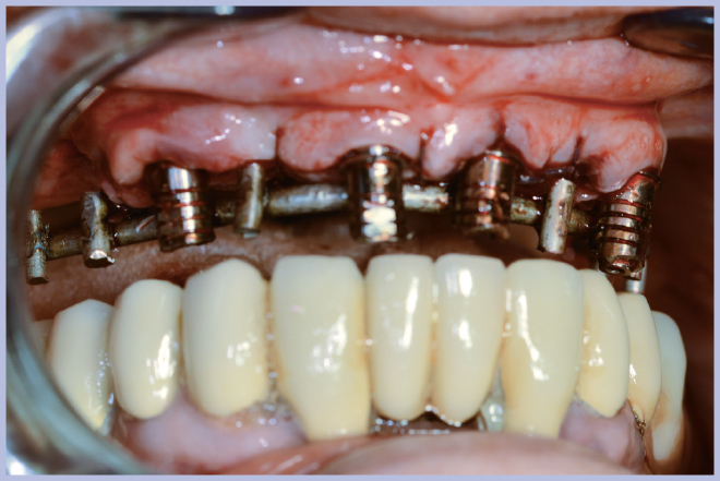 Sui monconi, dopo aver attivato la connessione a cono Morse (Fig. 3), sono state fissate le apposite cappette in titanio con le viti a testa alta (Fig. 4) ed è stata realizzata un’armatura di rinforzo per mezzo di una sincristallizzatrice intra-orale. In particolare la barra è stata ottenuta mediante saldatura sulle cappette di un filo pre-modellato di titanio grado 2 (Figg. 5, 6).
