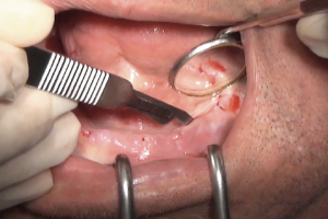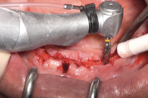 Dopo l’apertura del lembo (Figg. 8, 9) sono state trasferite sulla cresta ossea le 6 posizioni precedentemente rilevate con l’ausilio della fresa a lancia (Fig. 10) e i 6 siti implantari sono stati preparati il più possibile paralleli tra loro (Figg. 11-16).