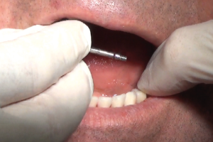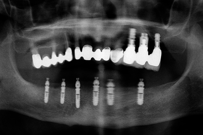 L’esigenza del paziente era quella di riabilitare in una sola seduta l’arcata inferiore edentula tramite protesi fissa a supporto implantare. Il moderato grado di atrofia, associato ad un discreto mantenimento dei normali rapporti intermascellari sul piano frontale, verticale ed antero-posteriore, avevano indirizzato la scelta verso una riabilitazione implanto-protesica tipo Toronto Bridge. Questo tipo di protesi permette la sostituzione protesica dei tessuti molli per evitare denti troppo lunghi e inoltre la disposizione implantare non deve necessariamente corrispondere con l’emergenza degli elementi dentali. L’esame radiologico ortopanoramico (Fig. 1) e l’esame Cone Beam effettuato a distanza di alcuni mesi dalle estrazioni (Figg. 2, 3) evidenziavano una sufficiente conservazione della cresta ossea in senso verticale e degli spessori ossei vestibolo-orali per l’inserimento di 6 impianti 4,1 x 12 mm.