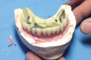 Dopo aver rimosso tutti i precontatti (Figg. 53, 54) si è restituito la protesi all’odontotecnico per la sua finalizzazione. Per la fabbricazione della protesi da consegnare al paziente, l’odontotecnico ha avvitato la protesi “provvisoria” con le viti lunghe polifunzionali sul modello (Fig. 55), realizzato una mascherina in silicone (Figg. 56, 57), rimontato i denti all’interno della mascherina (Figg. 58-60) e riempito le cavità residue con resina (Fig. 61).