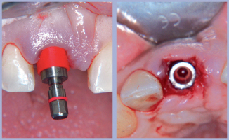 L’intervento è completato con la connessione immediata di un tappo di guarigione standard altezza 5 mm, utilizzato come moncone, sul quale si modella una corona provvisoria in composito (fig. 12). Si controlla che il provvisorio non abbia nessun contatto occlusale e nessuna funzione in lateralità (carico immediato non funzionale) (figg. 13-15b).