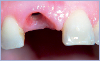 La paziente si presenta con la corona dell’elemento dentale completamente staccata dalla radice ed esprime una netta situazione di disagio e di preoccupazione per la sua estetica e per la funzionalità della sua bocca.