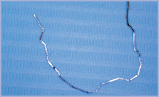L’eruzione forzata pre-estrattiva si attua mediante dispositivo ortodontico costruito estemporaneamente sul momento: si applicano due bande standard sui molari superiori, invertite dx con sx, in modo che la cannula sia palatina, si modella un filo rettangolare .016x.022 (fig. 5), si dà una piega di seconda Classe alle estremità dell’arco, in maniera che il filo sia sottoslivellato rispetto al piano occlusale degli incisivi, si porta l’arco a livello del gancio dell’incisivo e lo si lega. Il filo, essendo piegato verso il basso, tenderà a riprendere la sua forma iniziale e, in questo movimento, tenderà a portare verso il basso l’incisivo ad esso solidarizzato (fig. 6).