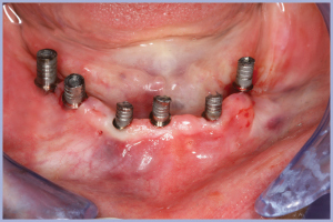 Gli impianti, sei, vengono posizionati tenendo conto delle esigenze protesiche oltre che della salvaguardia delle strutture anatomiche a rischio.