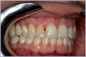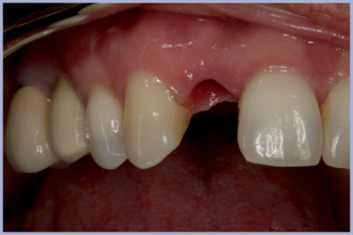 Si tratta di una paziente di sesso femminile di 45 anni in buone condizioni di salute generale con necessità di sostituire l’incisivo laterale superiore di destra per motivi parodontali (figg. 1-2). Le immagini cliniche prima dell’estrazione dell’elemento dentale in questione e del contestuale posizionamento implantare mostrano ottime condizioni di igiene orale ed una buona salute gengivale; la radiografia ortopanoramica (fig. 3) mostra gli esiti positivi di precedenti interventi implantoprotesici e, relativamente all’area da trattare, una notevole perdita ossea, in particolare del picco interdentale tra gli elementi 11 e 12.