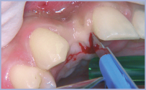 La porzione di lembo scollata (fig. 5) veniva successivamente privata dell’epitelio (fig. 6) e ribaltata al di sotto della porzione vestibolare del lembo stesso (fig. 7); la successiva sutura manteneva i tessuti stabilmente nella posizione raggiunta (fig. 8).
