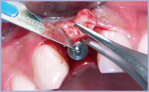 Già al momento del posizionamento implantare (figg. 12, 13, 14) si evidenziava un importante grado di atrofia caratterizzato dalla scomparsa della bozza vestibolare per riassorbimento della corticale; veniva inserito un impianto di 3,3 mm di diametro e 12 mm di lunghezza (fig. 15).
