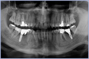 - Fig. 1 – Ortopantomografia a distanza rispettivamente di 6 anni e mezzo e 5 anni e mezzo dall’inserimento degli impianti