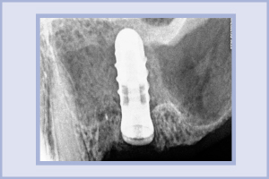 In data 3 luglio del medesimo anno inserii nella zona edentula un impianto Leone diametro 4,1 per 12 mm di lunghezza (Figg. 3 e 4). Durante il mese di dicembre 2008 protesizzai l’impianto con una corona in metallo ceramica. Poi per cinque anni non rividi più il paziente. Nell’ottobre del 2013 il medesimo paziente si presentò nel mio studio per delle carie.