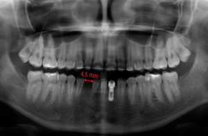 - Fig. 1 – Agenesia dell’incisivo laterale inferiore. Dopo il trattamento ortodontico lo spazio interdentale era di soli 4,5 mm. Si è pianificato l’inserimento di un impianto Leone 2.9