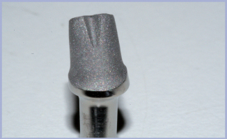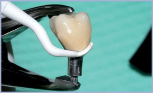 Dopo le prove estetiche e occlusali, abbiamo cementato la nostra corona sul moncone all’esterno del cavo orale, così da poter rimuovere perfettamente gli eccessi del cemento stesso (figg. 22-25); abbiamo quindi inconato il manufatto sulla fixture tramite doppia percussione (figg. 26-28).