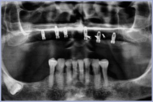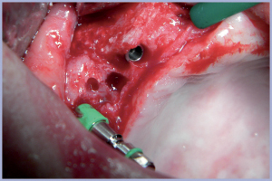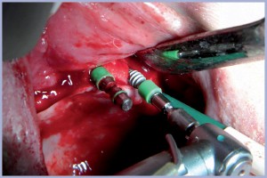 A Giugno 2011 si esegue l’intervento di implantologia sulla paziente. L’intervento segue quasi fedelmente quanto simulato sulla replica in resina: sul lato destro, una volta rimosse le viti di osteosintesi e verificata la stabilità dell’osso innestato si posizionano 3 impianti Exacone® Max Stability Ø 3,75 e, sul lato sinistro, senza rimuovere le viti di osteosintesi in quanto non interferiscono con l’inserimento degli impianti, si posizionano altri 3 impianti Exacone® Max Stability Ø 3,75.