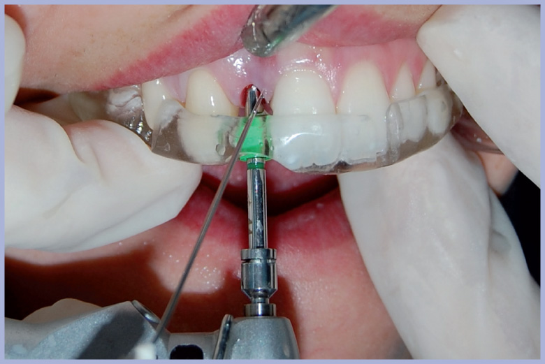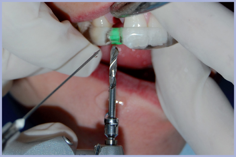 Dopo aver verificato la precisione della dima chirurgica (Figg. 19, 20), anche grazie alle finestre d’ispezione, e dopo il passaggio della fresa pilota (Figg. 21, 22) e della fresa Zero1 (Figg. 23-25), abbiamo inserito l’impianto montato sul carrier per chirurgia guidata, sempre utilizzando la mascherina senza boccola (Figg. 26, 27) come guida (Figg. 28-30).