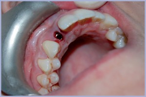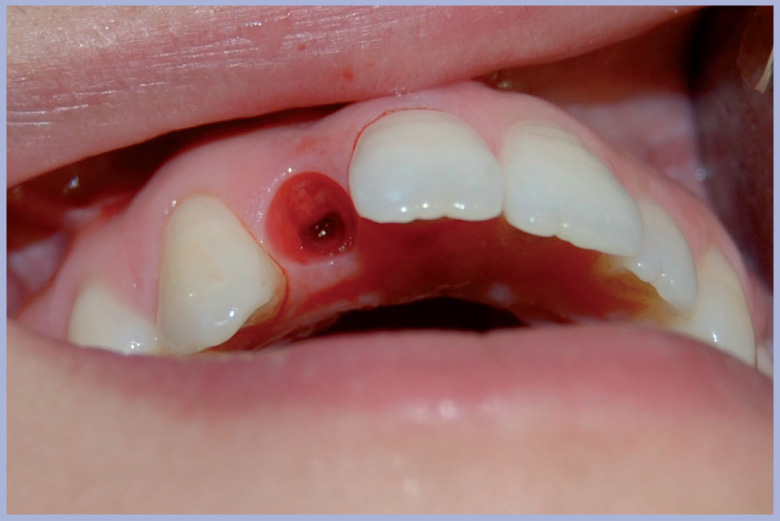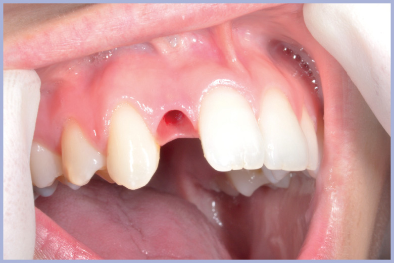 La paziente, di 29 anni di età , si è presentata alla nostra osservazione, presso il Reparto di Implantologia dell’Università degli Studi di Cagliari, lamentando dolore e leggera mobilità dell’incisivo laterale superiore di destra, oltre a sottolineare il grosso disagio estetico. All’esame obiettivo notiamo, oltre alla mobilità dell’elemento dentario, un’eccessiva inclinazione vestibolare della corona con conseguente inclinazione radicolo-palatale e relativa alterazione delle parabole gengivali (Figg. 1-3). La richiesta della paziente è stata quella di estrarre l’elemento in questione e di sostituirlo con una protesi fissa supportata da un impianto ed inoltre, di ottenere subito un ripristino estetico.