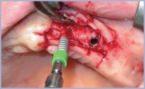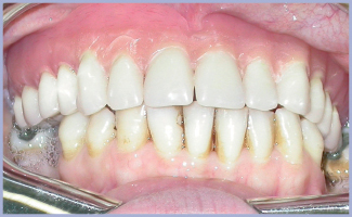 La paziente, di anni 44, a causa di una grave sofferenza dento-parodontale, ha perso tutti gli elementi dentali (fig. 1). Si decide di inserire 4 impianti per sostenere una protesi combinata, nel frattempo si realizza una protesi provvisoria (fig. 2). I quattro impianti diametro 3,3 mm vengono inseriti nelle zone 13, 14 e 22, 23 con l’uso alternato di frese ed osteotomi in relazione alla scarsa qualità ossea reperita. In considerazione delle esigenze estetiche e funzionali della paziente si opta per una tecnica sommersa (figg. 3-16). Dopo il condizionamento dei tessuti molli (fig. 17), si prende l’impronta con i transfer per la preparazione dei monconi e la realizzazione della protesi definitiva in laboratorio (figg. 20-22), si inseriscono i monconi negli impianti (figg. 18-19) e si posiziona il manufatto protesico (figg. 23, 24).