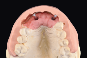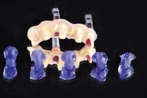 Sullo stesso modello con l’ausilio dei monconi di prova in plastica vengono selezionati i monconi ideali sia per inclinazione che per altezza transmucosa. Sono stati scelti 2 monconi per protesi avvitata Exacone® 360° con inclinazione di 15° e altezza transmucosa di 1,5 mm (Figg. 9, 10).