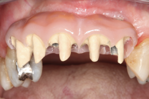 Il Sig. Mauro è un paziente che curo da venticinque anni. Oggi è in pensione, è diabetico e ha una malattia autoimmune (Guillain-Barré). Prende regolarmente metformina. Da ca. 14 anni è portatore di una protesi superiore fissa consistente in un bloccaggio metallo ceramica dal 13 al 22 sui denti pilastro 13-21-22. Si presenta con un ascesso della zona 11, zona edentula da molti anni. Data la situazione di partenza decido di non eseguire indagini RX volumetriche; il paziente acconsente ad un intervento esplorativo “aperto”, lasciandomi piena facoltà di decisione in quel momento.