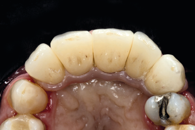 La mucosa viene realizzata in composito stratificato e lucidata con particolare attenzione nella parte inferiore per consentire al paziente di avere una corretta manutenzione della protesi e per agevolare le procedure di pulizia che garantiranno il mantenimento della salute dei tessuti gengivali intorno agli impianti (Figg. 32-35).