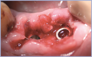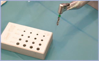 Dopo aver analizzato la TAC (figg. 3, 4) si decide l’utilizzo di due impianti Exacone®* Leone Ø 4,1, lunghezza 14 mm. Per il corretto posizionamento degli impianti si utilizza una mascherina preparata in laboratorio (fig. 5) e provvisori di resina completamente cavi, anch’essi preparati in laboratorio, sullo stesso modello di studio (fig. 6). Visto l’affollamento dei denti, il provvisorio sarà di tre elementi anziché quattro, la protesi definitiva sarà invece realizzata con quattro elementi. Si posizionano i gommini di stop a 14 mm sulle frese (fig. 7), si segue la consueta sequenza di lavoro: fresa pilota (fig. 8) e fresa finale (fig. 9). Gli impianti, come sempre nella situazione post-estrattiva, si inseriscono sotto cresta di 1-2 mm (fig. 10).