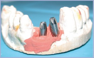 La fase protesica inizia con il posizionamento di due monconi standard dritti Ø 4,1 mm, segnati nella parte anteriore per riconoscerne la posizione sul modello di gesso, che saranno poi rimossi con del materiale da prima impronta (fig. 11); si prepara il modello di gesso con un’ampia finestratura nella zona di lavoro (fig. 12), nella finestratura si inserisce lo stesso materiale da prima impronta (fig. 13): i monconi bloccati in posizione dall’impronta presa in bocca sono così trasferiti sul modello di gesso in posizione precisa (fig. 14). Le radiografie degli impianti (fig. 15) sono state eseguite senza tappo mentre il tecnico stava fresando i monconi.