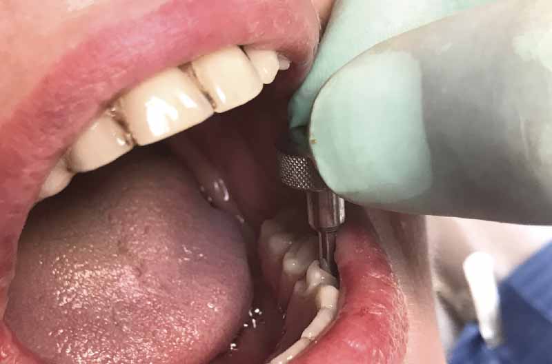Questo case report riguarda una paziente di 54 anni che arriva alla nostra osservazione con una situazione estremamente compromessa nell’arcata inferiore, denti mobili e difficoltà a masticare (Fig. 1). La paziente era già stata in altra sede dove le avevano proposto un intervento di innesto osseo prelevato dalla cresta iliaca oppure una protesi totale rimovibile. La richiesta della paziente era una protesi fissa non rimovibile senza sottoporsi ad interventi invasivi di innesto osseo.
