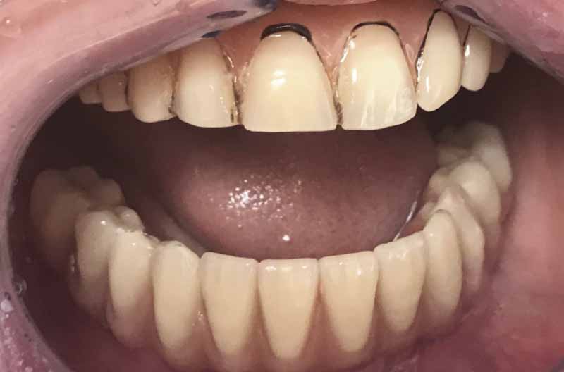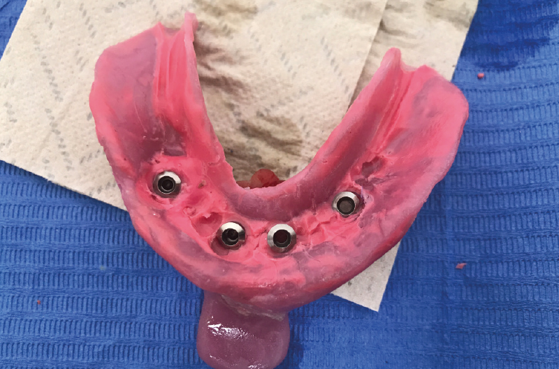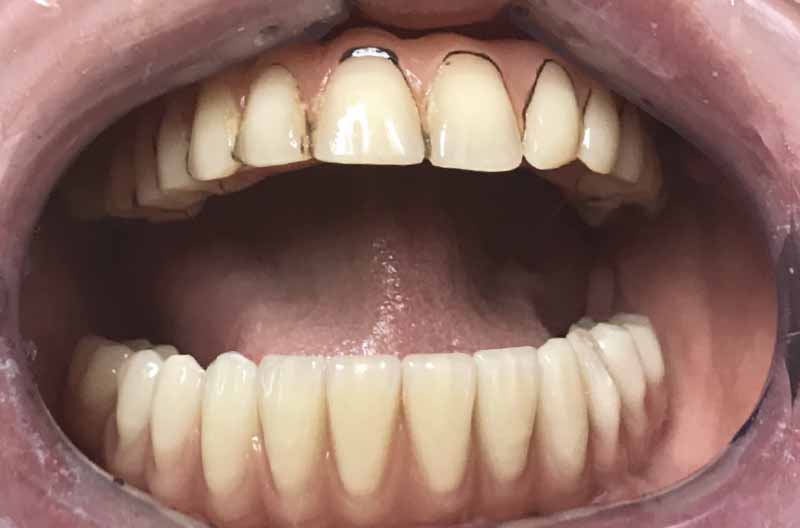 Viste le aspettative della paziente e la quantità di osso disponibile (Fig. 2) si propone come soluzione la tecnica All-on-Four. Il metodo All-on-Four consiste nel posizionare a livello mandibolare quattro impianti intraforaminali, di cui due nella zona degli incisivi laterali e due distali inclinati (“tiltati”) davanti ai forami mentonieri.