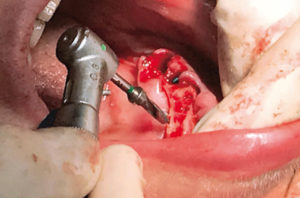 Si preparano quindi prima i due siti distali per gli impianti 3,3 x 12 mm utilizzando le frese Leone con stop integrale passando come ultima fresa quella dedicata per tutta la lunghezza. L’osso, essendo molto denso, ha bloccato l’inserimento degli impianti con il manipolo ad una distanza di circa 4 mm prima di arrivare nella posizione finale.