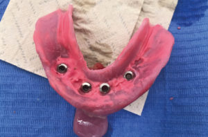 Dopo l’inconamento, avvito delle cappette in titanio sui monconi per protesi avvitata prelevate sempre dalla valigetta Leone ed eseguo una sutura per prima intenzione con materiale riassorbibile (Figg. 24, 25). Si rileva un’impronta in silicone con porta impronte individuale forato in prossimità delle emergenze delle cappette (Fig. 26).
