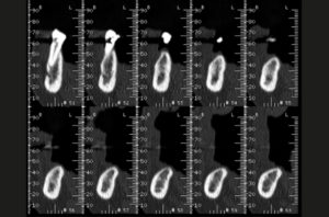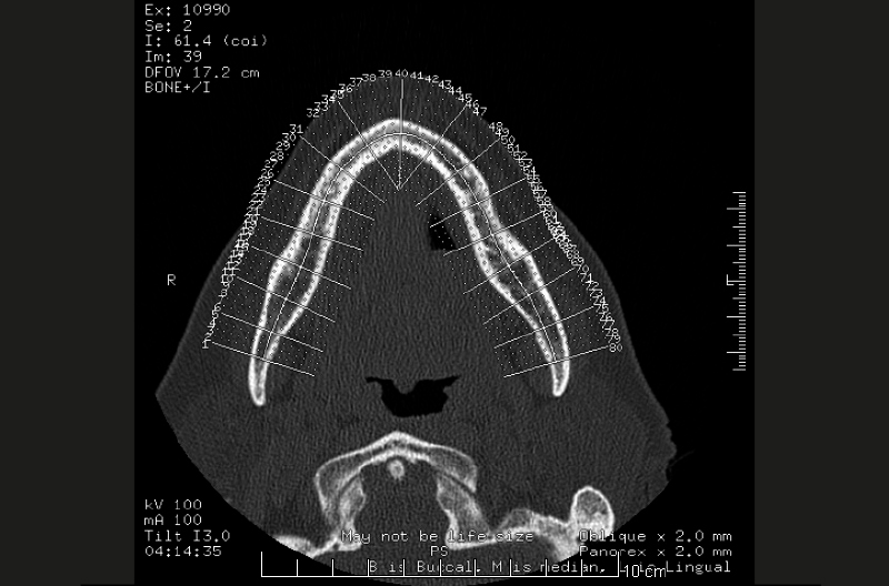 L’esame Cone Beam ci permette di evidenziare le strutture anatomiche di interesse, i forami mentonieri e il canale incisivo; grazie allo studio dell’esame 3D, vista la disponibilità ossea e la presenza di un osso denso (Figg. 3-6), si decide di utilizzare due impianti Leone diametro 3,3 mm e lunghezza 12 mm e due impianti Leone diametro 3,3 mm e lunghezza 10 mm.