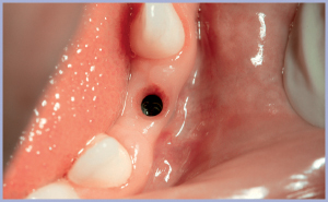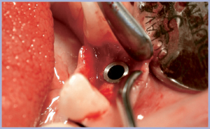 Si inserisce in anestesia locale un impianto Exacone® 3,3×10 mm (figg. 3, 4) in tecnica monofasica, utilizzando un tappo di guarigione con piattaforma standard.