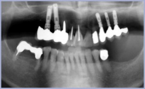 Il grado di atrofia condiziona la direzione di inserzione degli impianti. Nel mascellare superiore l’atrofia si verifica nei tre piani dello spazio in senso centripeto e gli impianti saranno inseriti tanto più orizzontali quanto più marcata è l’atrofia. Nel caso in esame si verifica tale evenienza: ne consegue la necessità di usare monconi molto angolati. Monconi di titanio pieni fresabili ci permettono di sopperire alla notevole angolazione tra protesi e impianti. Ovviamente il carico risulta disassato rispetto all’asse implantare: è un compromesso dal punto di vista biomeccanico. Nel caso in esame il carico è ridotto dalla parziale assenza di antagonisti. L’eccessiva angolazione dei monconi comporterà un profilo di emergenza protesico non adeguatamente estetico. Solo una posizione più profonda dell’impianto permetterà di emergere col manufatto con un profilo più edeguato. La presenza di una connessione moncone-impianto in profondità comporta peraltro maggiori rischi di “instabilità microbiologica”. È, infatti, la presenza del gap moncone-impianto responsabile del riassorbimento osseo peri-cervico-implantare. Spesso una migliore estetica sarà un compromesso con il mantenimento microbiologico.