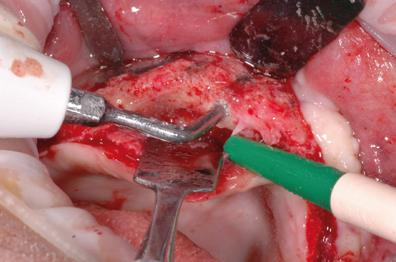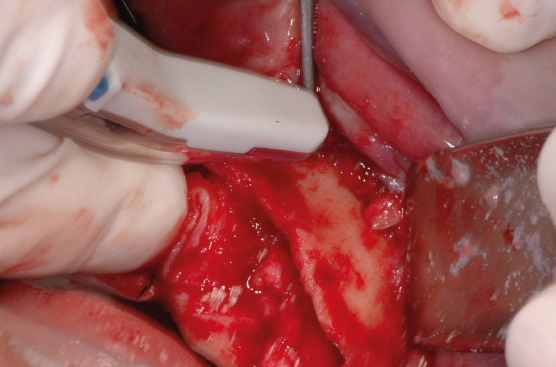– prelievo del tessuto osseo con pinza ossivora e Safescraper dalla spina nasale e dai tuber (Figg. 7-10) al fine di ottenere un rapporto tra osso del paziente e osso sintetico del 50%. Nei casi in cui l’osso prelevato dalla spina nasale e dai tuber non fosse sufficiente, eseguo un’incisione in zona retromandibolare inferiore, che nella mia routine rimane la più usata, ma che ovviamente comporta una doppia apertura con conseguente maggiore discomfort per il paziente;