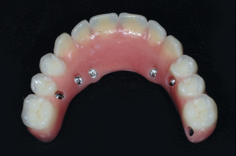 Verifico in studio la passività della struttura metallica con il test di Sheffield e mi accerto che tutte le viti arrivino a fine corsa senza nessun tipo di trazione. Solo dopo questa verifica si procede con la realizzazione della protesi definitiva con l’ausilio delle guide in silicone ricavate dalla protesi provvisoria funzionalizzata. Dopo il montaggio dei denti sulla struttura si verifica in studio l’estetica, l’occlusione e la fonazione e infine si procede in laboratorio alla finalizzazione e personalizzazione della Toronto Bridge (Figg. 57-60).