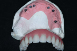 Inizia la parte protesica odontotecnica. Il tecnico cola il modello con gli appositi analoghi da gesso per monconi per protesi avvitata (Fig. 56). Duplica sul modello la protesi totale provvisoria che servirà da guida per la realizzazione del manufatto definitivo e crea sulle cappette in titanio una struttura in cromo cobalto fissata con saldatura laser.