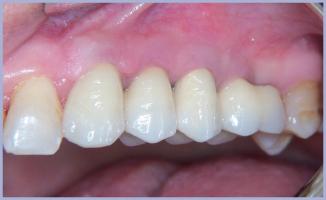 Ciò che si osserva nelle immagini relative alla consegna (figg. 25-27) ai vari controlli clinici, effettuati ad 1 settimana (fig. 28), a 1 mese (fig. 29), a 3 mesi (fig. 30), a 6 mesi (fig. 31) e a 8 mesi (fig. 33), è un notevole miglioramento dell’estetica gengivale, con completo ripristino della normale festonatura e recupero delle papille interdentali. Il recupero estetico gengivale da una parte dipende dalla morfologia protesica con profilo d’emergenza adeguato e corretto posizionamento dei punti di contatto, ma sicuramente un ruolo importante è giocato dalla conometria. Questa, infatti, grazie all’annullamento del gap e dei micro-movimenti moncone-impianto, consente un ottimo mantenimento dell’osso crestale, come evidenziato dalle radiografie di controllo (fig. 32), e una eccellente qualità dei tessuti molli peri-implantari, con importati risvolti sull’estetica gengivale degli elementi implanto-protesici.