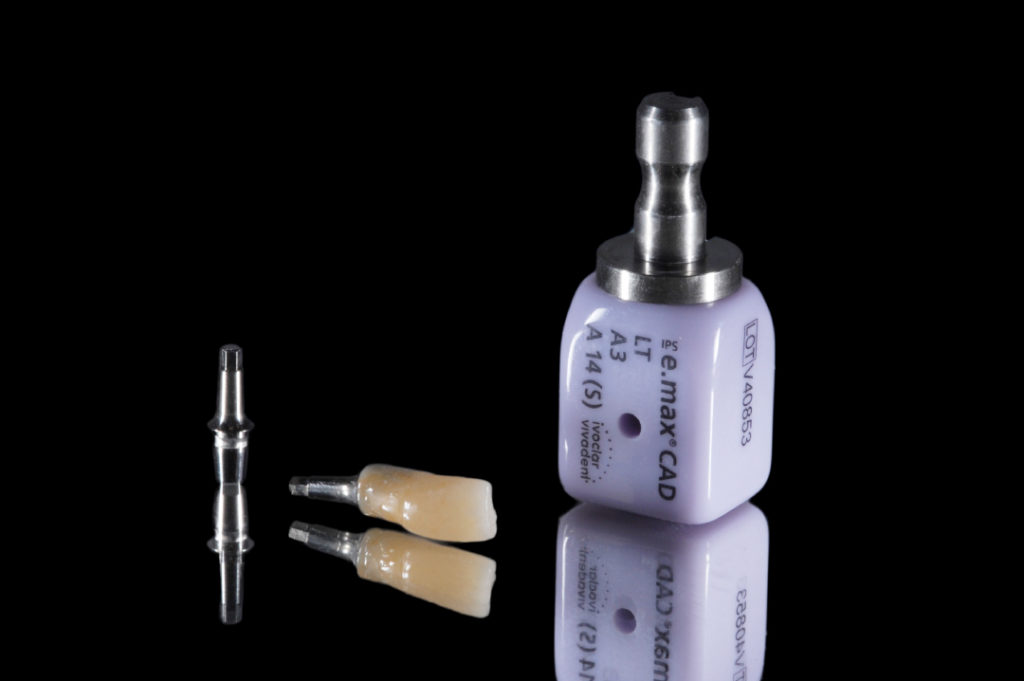 View of Leone Ti-Base abutment, crystallized lithium disilicate crown luted to a Leone Ti-Base abutment and Ivoclar Vivadent e.max CAD block
